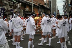 神輿渡御・区内巡行を終え、白山神社前にて神輿を囲む担ぎ手と区内の人々。 平安末期1177年(治承元年)加賀白山社から都に神輿振り(神輿を奉じての強訴)にやってきて、叶わぬままに打ち捨てられた3基の神輿のうちの1基をお祀りしたことが、この白山神社の起りとなっています。 毎年9月19日(例祭)に近い土・日曜に白山神社秋の大祭を執り行ない、年に一度の神輿渡御 区内巡行をします。 |