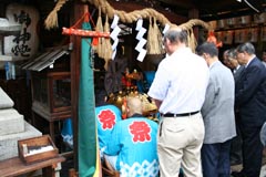 白山神社秋の大祭のための神輿への御霊入れの様子です。 宮司が本社から御霊を神輿へとお移しする際に、周囲の氏子や担ぎ手たちは「オー」と低い声を出してお迎えします。 平安末期1177年(治承元年)加賀白山社から都に神輿振り(神輿を奉じての強訴)にやってきて、叶わぬままに打ち捨てられた3基の神輿のうちの1基をお祀りしたことが、この白山神社の起りとなっています。 毎年9月19日(例祭)に近い土・日曜に白山神社秋の大祭を執り行ない、年に一度の神輿渡御・区内巡行をします。 |