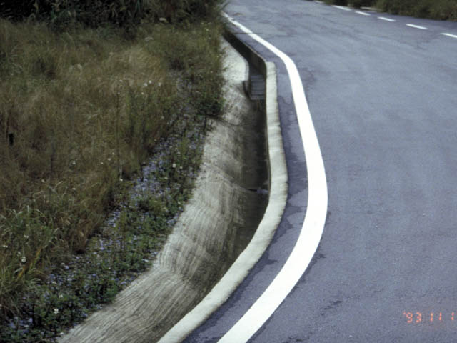 | 道路の側溝に動物が落ちても脱出できるように片方を斜めにしてあります。
