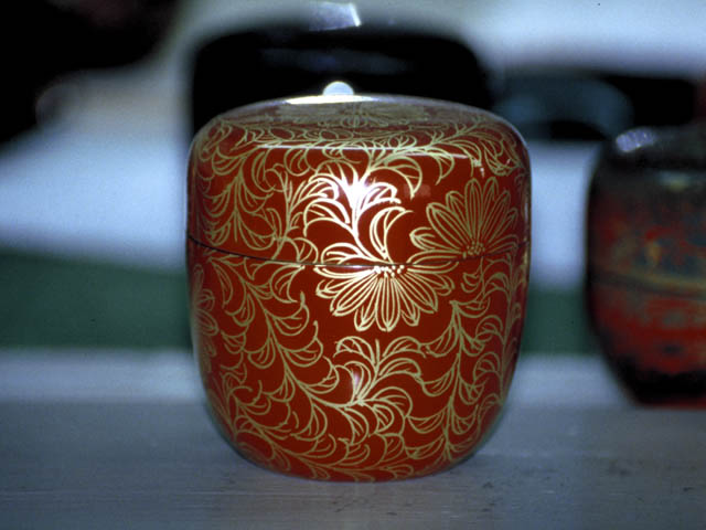 | 器物に沈金,刀等彫り模様を施し、そこに漆をすりこみ、油紙などで模様以外の部分の漆を拭き取り、仕上げに金箔や顔料などをすりこみます。