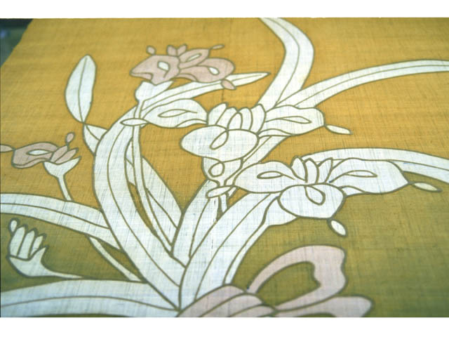 | 型置布地に型紙,あみの順でのせ、ヘラでのりを平らに伸ばして型を取ります。乾かしてから色差しをします。