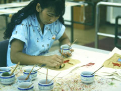 | 一度染めて乾かした後,黒やおちついた赤などで染めると,のりを落とした時にリズム感や立体感がでます。
