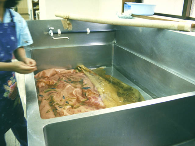 | 色差しやくま取りの後、4〜5日置いてかわかします。それから一晩水につけてのりをやわらかくし、水で濯ぎ洗いをしてのりを落とします。絞らずに乾かして裏からアイロンで仕上げます。