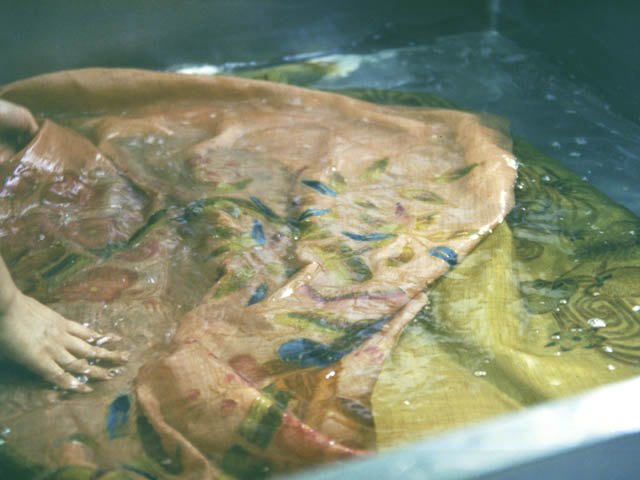 | 色差しやくま取りの後、4〜5日置いてかわかします。それから一晩水につけてのりをやわらかくし、水で濯ぎ洗いをしてのりを落とします。絞らずに乾かして裏からアイロンで仕上げます。