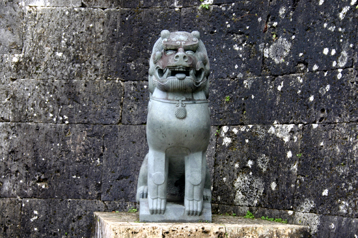 | 歓会門の前、右側に立つシーサー。