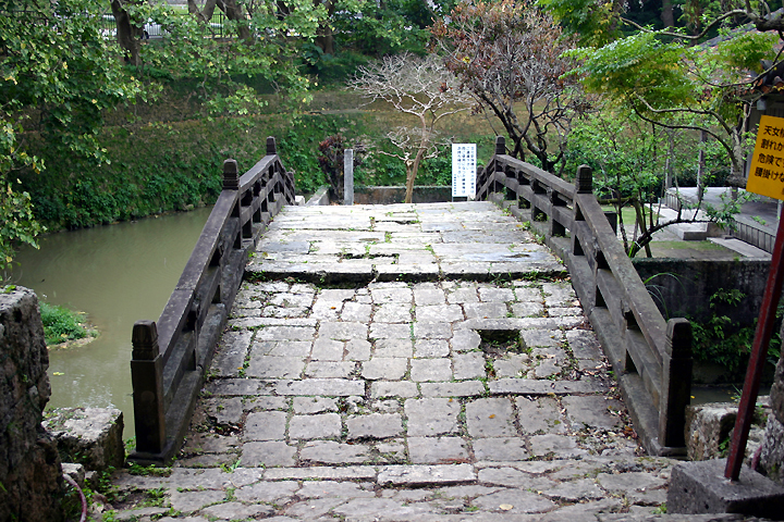 池(円鑑池)の中に小島を作り、そこに弁財天堂(べざいてんどう)を建て、天女橋で結んだ 1969年に復元された。 この天与橋は国指定重要文化財。 |