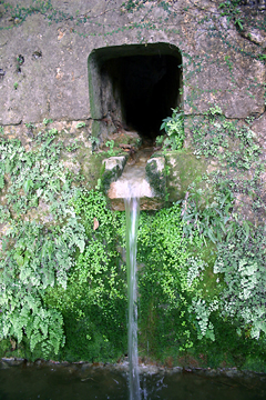 造りです。 湧泉の素晴らしさは、まず不整形な積み石の面がカミソリさえも差し入れられないほど精巧にかみ合う”あいかた積み”の手法が取り入れられていることです。 そして、湧泉に降りる15段を数える石畳道の下側の5段が自然の岩盤を削って仕上げられ、湧泉の外側に広場を設けるなど、至るところに当時の知恵と工夫がうかがえます。 |