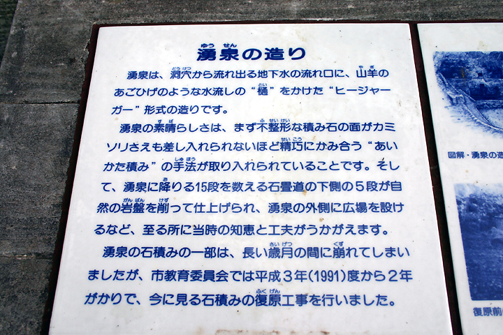 造りです。 湧泉の素晴らしさは、まず不整形な積み石の面がカミソリさえも差し入れられないほど精巧にかみ合う”あいかた積み”の手法が取り入れられていることです。 そして、湧泉に降りる15段を数える石畳道の下側の5段が自然の岩盤を削って仕上げられ、湧泉の外側に広場を設けるなど、至るところに当時の知恵と工夫がうかがえます。 |